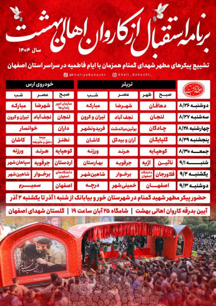برنامههای استقبال از کاروان اهالی بهشت در روز دوشنبه ۳ آذر، مصادف با سالروز شهادت حضرت فاطمه زهرا سلاماللهعلیها، با حضور تریلر و ارس در شهر اصفهان آغاز میشود که جزئیات آن متعاقباً اعلام خواهد شد.